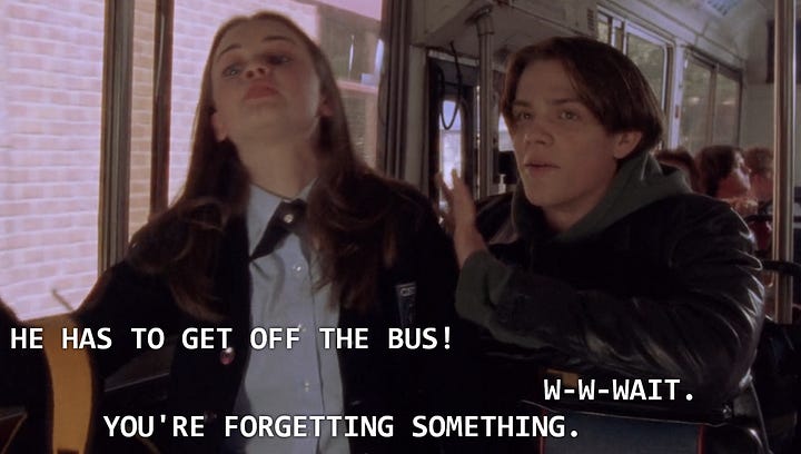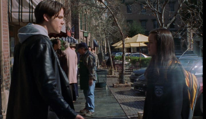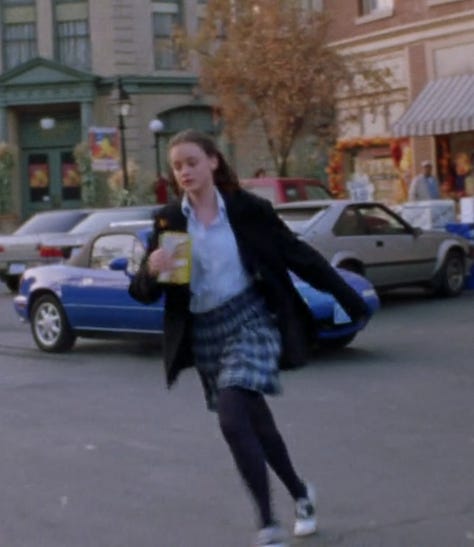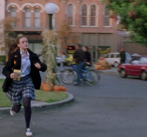 In another scene, Rory embarrasses herself in front of Dean after saying “thank you” in response to their first kiss. She runs out of the grocery store, into the street, flustered and wanting out of the situation as soon as possible. Thankfully she doesn’t throw herself into a car because the store, while in the downtown, is on a street (and not a stroad). Vehicles are going slow enough that they can react to her and stop. That’s forgiving infrastructure!1