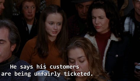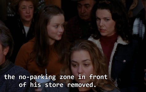 The moment I realized Gilmore girls thematically aligned with the “pro-people” groups was in this scene with Lorelai. A local business owner is bringing up creating more free parking spaces in front of his business at a Town Hall. This immediately makes me smirk, thinking about the wasted opportunity of non-metered parking spots. And Lorelai makes the same face I did with the explicit argument!