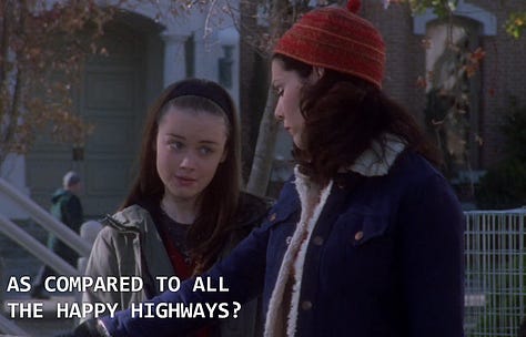 Lorelai: “It’s a sad highway”; Rory: “as compared to all the happy highways?”