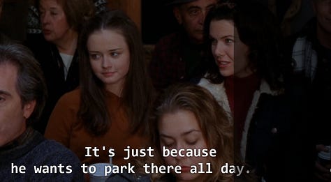 Lorelai: “No, it’s just because he wants to park there all day.”