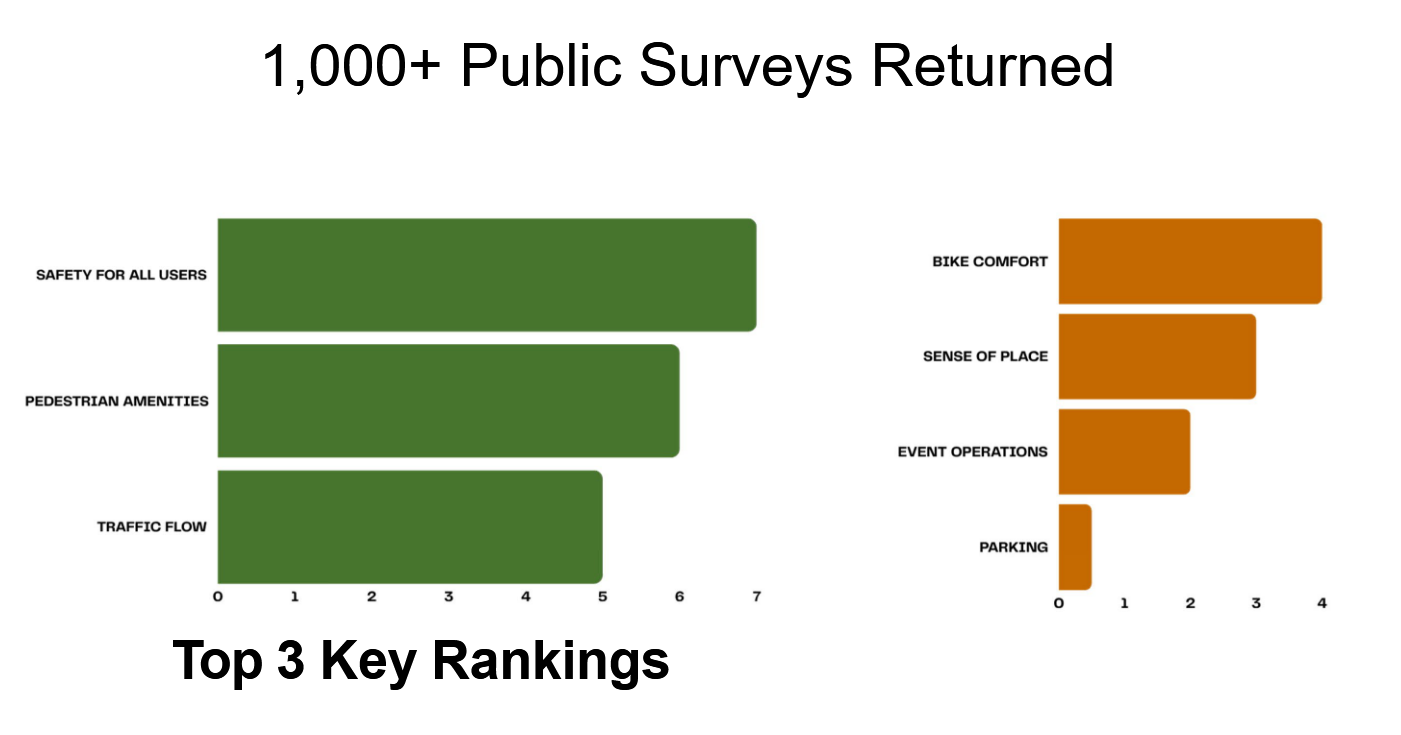 These show safety as the top priority, followed by pedestrians and traffic flow. The bottom considerations are parking and event operations, with bike comfort and sense of place in between.