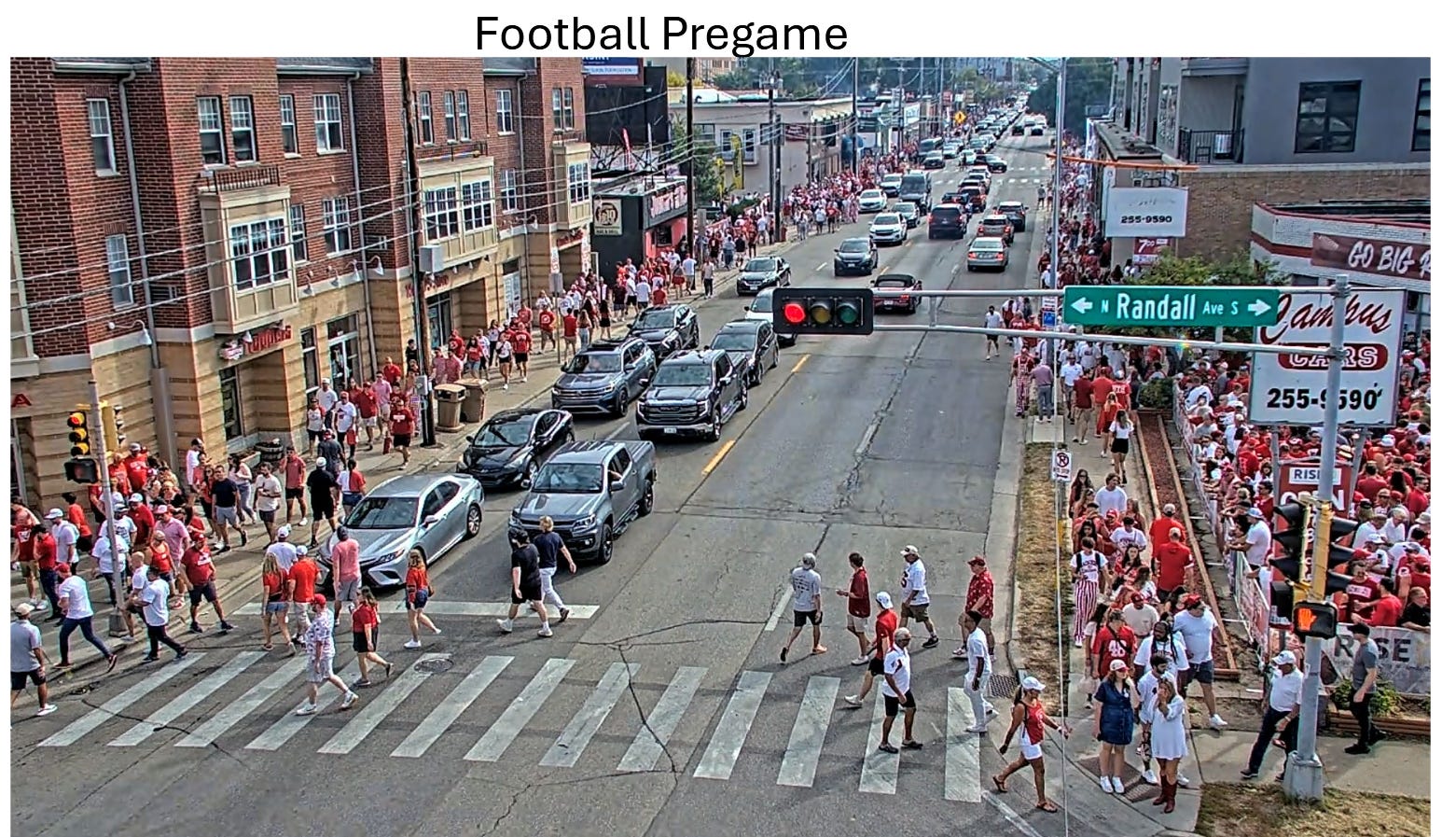 This mindset is still too focused on vehicle throughput. Regent Street, as a place where apartment buildings are going up fast and business is expanding, should be safe enough to cross at any point. Like the Dutch cities I got to experience, cars should defer to people. Bikes would be able to safely ride in front of the storefronts, window shopping until deciding at a moment’s notice to stop in and buy a donut. The street would be easy to shutdown for Football Saturdays to avoid messes like this:
